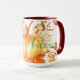Bem-vindo ao outono com uma caneca de café decorada em uma abóbora, folhas e design de flores de outono. Uma abóbora amarela-ouro ilustrada fica entre folhas vermelhas e douradas e pequenas flores cor-de-rosa Aster. Um texto grande, azul-esverdeado na caneca diz, "Bem-vindo ao outono" e é personalizável. Mugs têm seleções de cores.