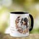 Uma bonito coroa de outono em tons de cinamão marrom, bronzeado e creme rodeia a imagem aquosa de um Cão de Montanha Bernês. A imagem é impressa duas vezes na caneca, com seu texto personalizado entre eles.
