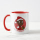 Caneca de Natal com uma ilustração de uma menina ou rapaz preto feliz sorridente e sorridente, o bebê está vestindo roupas vermelhas e brancas e segurando um presente; com modelo de texto editável para seu nome ou mensagem, design de Natal