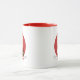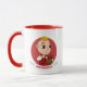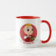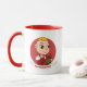 Caneca de Natal com uma ilustração de uma menina ou rapaz feliz sorridente, o bebê está vestindo roupas vermelhas e brancas e segurando um presente; com texto editável modelo para seu nome ou mensagem, design de Natal
