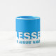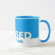 Azul moderno BESSADO em nome de Jesus, caneca cristã, com a palavra BESSED em tipografia BRANCA e IN JESUS em AZUL. Todo o texto é PERSONALIZÁVEL, para que você possa criar seu próprio texto e adicionar sua referência de script favorita. Esta caneca daria um presente de excelente para o Natal, Aniversários, Dia de as mães, Dia de os pais, etc. Outras cores (incluindo as versões de brilho) estão disponíveis.