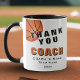 Bola Moderna de Basquete Obrigado Treinador Mug. Esta caneca personalizada para treinador tem bolas de basquete. caneca de manutenção do excelente para agradecer aos treinadores desportivos, treinadores da equipe segundo grau, treinadores de mãe ou pai, etc. Personalize qualquer texto na caneca. Adicione o nome do treinador, o nome da equipe e o ano.