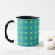 Uma caneca branca e preta de Ringer com um padrão Bolinhas de Luas Azuis em Neon Green e Azul Azuis em um fundo Verde Esmeralda. Parte da coleção 'Luas Azuis' de Posh & Painterly.
