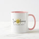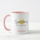 Uma adorável caneca de café sunshine ou caneca de leite de chocolate para as crianças! Personalize a cor de dois tons! A caneca é mostrada aqui em branco com uma alça rosa. Bom dia, Sunshine Script está em preto sobre um simples, brilhante, sol amarelo. Personalize!