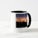 Um nascer do sol da manhã sobre a cidade de Baltimore em uma caneca branca com guarnição preta no punho e na borda.