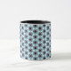 Repetir padrões geométricos numa formação simétrica usando tons azuis, pretos e brancos. A design centra-se em motivos circulares organizados para criar um efeito visualmente envolvente e equilibrado.