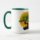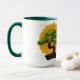Uma bela ilustração de uma árvore bonsai que se senta num pote preto contra um fundo circular amarelo brilhante.