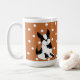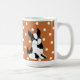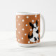 Um legal Boston Terrier em um fundo marrom com bolinhas brancas.