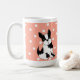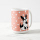 Um legal Boston Terrier em um fundo de coral com bolinhas brancas.