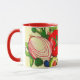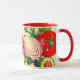 Vegetables art with text Shop Healthy with matching red handle and inside. Vegetables include red onion, tomato, avocado, broccoli, black beans and herbs. Colorful and cute. Realistic vegetables drawn by Patricia Villa.