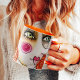 Esta caneca de arte caprichosa é projetada usando uma safra divertida da minha ilustração original de menina esquisita, "Frenchie". Ela tem cabelos vermelhos acentuados com voadas espirais aleatórias, um olho verde e um olho azul, lábios e bochechas cor-de-rosa brilhantes e um nariz longo e louco.