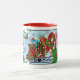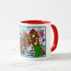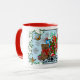 Uma fada de morena toda em vermelho e verde num pano de fundo azul e verde com flocos de neve. À sua volta estão brinquedos, presentes de Natal enrolados e símbolos de Natal.