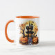 O exterior desta caneca de bruxa francesa assombrada apresenta uma base branca brilhante. Esta caneca é perfeita para um amante francês do Bulldog e um amante da época das bruxas.