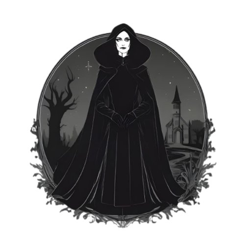 Explore o lado negro e misterioso de Salem com esta ilustração gótica de uma Bruxa Salem. Fechado a preto e em pé contra o pano de fundo de uma igreja assombrada e árvores torcidas, esta design captura a essência da beleza gótica e da história sombria de Salem.Perfeito para amantes da fantasia escura, bruxas e temas místicos.
