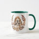 Uma bonito coroa de outono em tons de cinamão castanho, bronzeado e creme rodeia a imagem aquosa de um Cachorro de Caça Basset. A imagem é impressa duas vezes na caneca, com seu texto personalizado entre eles.
