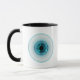 Um olho azul cibernético com vários monitores digitais, incluindo círculos, pontos e quadrados, alguns iluminados para cima e outros não, com uma pequena cruz no meio e a palavra "visão" para trás na parte inferior direita.