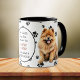 Um lindo Cachorro ChowChow vermelho laranja fica em dois lados desta caneca. O texto entre as duas imagens diz: "No oitavo dia, Deus criou o CHOWCHOW e o chamou de MUITO BOM". As imagens do cão e o banner branco oval que contém os campos de texto são colocados sobre um fundo branco com impressões de pata preta.
