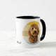 Um retrato de um lindo Cachorro de Goldendoodle é a característica nesta caneca. A imagem é colocada sobre um fundo solar retrorreflector, ligeiramente angustiado, bronzeado e faixa azul, e impressa duas vezes na caneca. Seu nome está em um script preto entre as imagens.