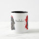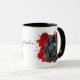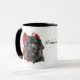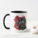 Um belo retrato a cores da água de um Cachorro da Terra Nova se destaca contra um fundo vermelho brilhante de pintura de abstrato. A imagem está em dois lados da caneca, com seu nome ou outro texto personalizado a preto entre eles.