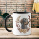 Uma bonito coroa de outono em tons de cinamão castanho, bronzeado e creme rodeia a imagem aquosa de um lindo Cão Dachshund Wirehaired. A imagem é impressa duas vezes na caneca, com seu texto personalizado entre eles.