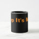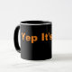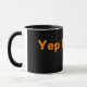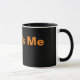 Caneca preta de café com texto cor de laranja.