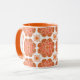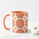 Este café ou uma caneca de chá impressionante apresenta um padrão de medalhão vermelho e laranja. As cores incluem tons de vermelho e ferrugem em um fundo branco. o dentro e a alça são laranja claro. Torne mais clara a sua cozinha rural ou casa de fazenda com esta caneca brilhante e alegre. Comprar para a próxima festa de chá. Esta design vem do azulejo de Oregon Fay Jones Day.