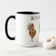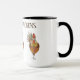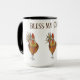Esta caneca de café de duas tonalidades é agarrada por algumas bonito galinhas coloridas para ajudá-lo a acordar com o seu peito matinal favorito. Três frangos junto com texto lendo Bless My Chickens com interior preto e manípulo. Múltipla coloração na caneca branca. Personalizar este item ou comprar conforme projetado. imagem de estoque freepik.com