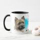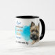 Um retrato de aquarela de um lindo Cairn Terrier Dog é a característica em dois lados desta caneca. Cada imagem é colocada sobre um fundo azul brilhante de tela plana. Entre as duas imagens está o texto que descreve esse companheiro leal e brincalhão, com "CAIRN TERRIER dog" em preto no fundo. Todo o texto é facilmente personalizado para qualquer coisa que você preferir para que você possa personalizá-lo ou descrever seu próprio amigo leal!