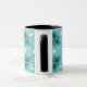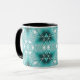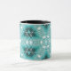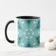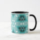 Um design caleidoscópico branco e turquesa impressionante, com padrões geométricos intrincados, linhas vivas e formas semelhantes a estrelas simétricas. Este trabalho de arte abstrato ousado e moderno combina tons legal de gelo com detalhes fractais dinâmicos, criando uma peça visualmente cativante perfeita para decoração doméstica, roupa ou acessórios.