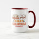 Camping Merry Christmas Reindeer Personalised Name Coffee Mug apresenta o texto "Feliz Natal" numa tipografia retrô com uma caravana decorada festiva sendo puxada por renas e acentuada com flocos de neve e holly. Personalize com seu nome personalizado para um super presente. Presente perfeito para a família e amigos no Natal e feriados. Projetado pelo Evco Studio www.zazzle.com/store/evcostudio