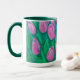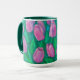 Caneca de café com pintura floral colorida, cheio verde esmeralda de lindas flores de primavera. As tulipas cor-de-rosa simbolizam um sentimento de felicidade, autoconfiança e positividade. Este excelente ajustado para Páscoas ou saudações do dia da Mulher, ou como presentes de aniversário para meninas e mulheres. Paleta de cores: Emerald, Mint e Viridian Green, Pink, Lavanda. © Clipso-Callipso/Julia Khoroshikh www.juliakhoroshikh.art #tulipsart #pinktulips#tulipainting #springflower #floralart #floralprint #floralpillows #contemporaryfloral #wildflower #floralart #summerblossom #drinkware #springgifts
