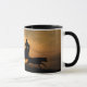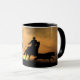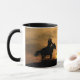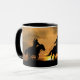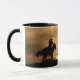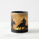 Tambores de equipe com bois no pôr do sol ou nascer do sol. Uma caneca de café ocidental de cowboy excelente.