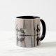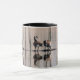 Esta caneca apresenta seis gansos do Canadá migrando sentados em um log em um lago superficial. As suas marcas marrons, pretas e brancas refletem-se na água. As ondulações criam um padrão vertical fascinante de troncos de árvores refletidos.