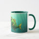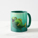 Esta é uma caneca com um peixe verde desenhado nela.