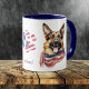 A característica desta caneca única é uma imagem aquosa de um lindo cão German shepherd embrulhado num lenço de bandeira americano. A imagem está em dois lados da caneca, com estrelas e listras e seu texto personalizado entre elas.