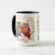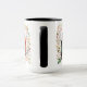 Nesta caneca única, duas corujas com padrões de estilo boho se juntam em um galho de árvore. Uma coruja é verde e dourada; a segunda coruja é vermelha/laranja e ouro. Estão rodeados de ouro e folhas verdes do outono. A imagem é impressa duas vezes na caneca.