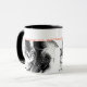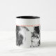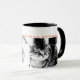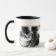 Uma caneca branca com uma jante preta e uma alça e uma fotografia preta e branca de fecho de um gato meio-birmanês vigilante. Em vermelho, logo abaixo da borda estão as palavras, "observando você me observando..." Também estão disponíveis mousepad e totebag correspondentes.