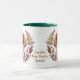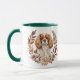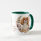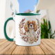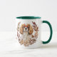 Uma bonito coroa de outono em tons de cinamão marrom, bronzeado, e creme rodeiam a imagem de um Rei Cavaleiro Charles Spaniel. A imagem do cão é impressa duas vezes na caneca, com o seu texto personalizado entre eles.
