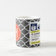 Canecas quentes do chá da prescrição engraçada. Escreva sua própria prescrição! Adicione seu nome, seu doutor, seu chá favorito e mesmo suas próprias instruções! Faça se engraçado, faça-lhe seu! Monograma feito sob encomenda! Caracterizando um teste padrão cinzento escuro bonito de Quatrefoil do marroquino. Círculo alaranjado com monograma branco.
