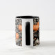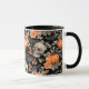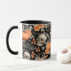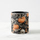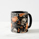 Uma charmosa caneca de Halloween que apresenta abóboras, crânios, morcegos e flores de outono sobre fundo preto. Um acessório de feriado excelente para a temporada de Halloween.