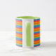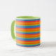Uma Caneca Branca de Ringer Chic com lábio e alça verdes e faixas diagonais brilhantemente coloridas em Vermelho Brilho, Laranja, Amarelo, Azul e Verde. Parte da coleção Posh & Painterly 'Marigold Medley', este padrão irá ajustado todos os travesseiros.