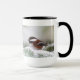 Foto de um chickadee que senta-se na neve em um ramo de pinheiro. Esta imagem pode ser personalizada com suas próprias palavras como necessário.