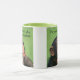 Branco e limão 11 oz. combo caneca com uma imagem, de ambos os lados, de um chimpanzé viscoso a verde e uma observação facultativa e inofensiva.