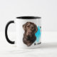 Um retrato de um lindo Cachorro Labrador Retriever de chocolate é a característica em dois lados desta caneca. Cada imagem é colocada sobre um fundo azul brilhante de filtro. Entre as duas imagens está o texto que descreve esse companheiro leal e corajoso, com "o cão LABRADOR RETRIEVER" em preto no fundo. Todo o texto é facilmente personalizado para qualquer coisa que você preferir; descreva seu próprio amigo leal!