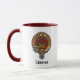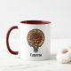 Crachá da crista Clan Cameron rodeado por uma correia e fivela sobre fundo tartano. Texto personalizado de ambos os lados.