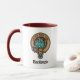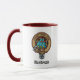 Crachá da crista Clan MacKenzie cercado por uma correia e fivela sobre o fundo marrom de tartan caçador. Texto personalizado de ambos os lados.