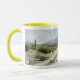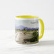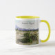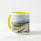 Codorniz de Santan: a caneca de café do Dois-tom (o punho cerâmicos, do amarelo e a borda brancos) com codorniz de Santan projeta, da deserto da arizona opinião das montanhas de Santan, gráfico digital do corpus Omphalos do livro, poesia e coleção de arte 2012, por Mary Elizabeth Kibler, autor/artista