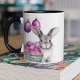 Cinzas bonitas e coelho branco de Páscoa com cerise e polca roxa elétrica pontilhados ovos de Páscoa em um cesto verde-assado - junto com dois ovos de Páscoa pendurados no topo dessa caneca de café Páscoa. Personalize a frente e o centro desta caneca de coelho temido da Páscoa com seu nome. Altere a fonte e a cor da fonte, se necessário. Aproveite! Isto faz um presente Páscoa excelente.