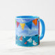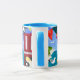 Uma caneca branca com jante azul de pó e alça e uma colagem de papel pintada à mão de uma cena lateral clara e colorida. Consulte também cartão de saudação, poster, presentes e roupa.
