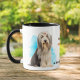 Um retrato de um adorável Cachorro Collie é a característica em dois lados desta caneca. Cada imagem é colocada sobre um fundo azul brilhante de filtro. Entre as duas imagens está o texto que descreve esse companheiro gentil e leal, com "o cachorro COLLIE BEARDED" em preto no fundo. Todo o texto é facilmente personalizado para qualquer coisa que você queira para que você possa descrever seu próprio amigo leal.